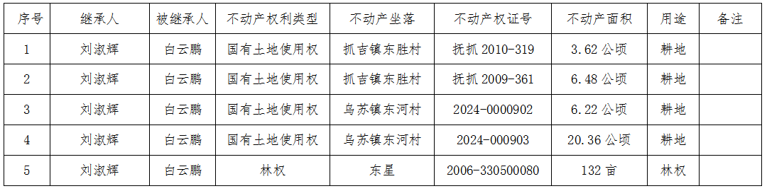 经初步审定,我机构拟对下列不动产权利予以继承登记,根据《中华人民共和国民法典》第一百二十四条和《不动产登记暂行条例实施细则》第十七条的规定,现予公告。如有异议,请自本公示之日起二十个工作日内( 2025年11月13日之前)持异议书面材料到本登记机构办公场所提出异议,并提供有关材料。逾期无人提出异议,本登记机构将予以登记。