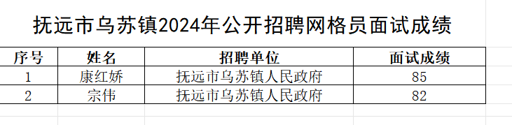 根据《乌苏镇社区网格员招聘公告》要求,面试工作已经结束。现将拟进入体检、考察环节人员及其成绩进行公示,具体名单详见如下图片。如考生对本人成绩有异议,可在公示期内反映,反映情况和问题必须实事求是,应以书面形式反馈,签署真实姓名、工作单位和联系方式,对匿名信和匿名电话不予受理。