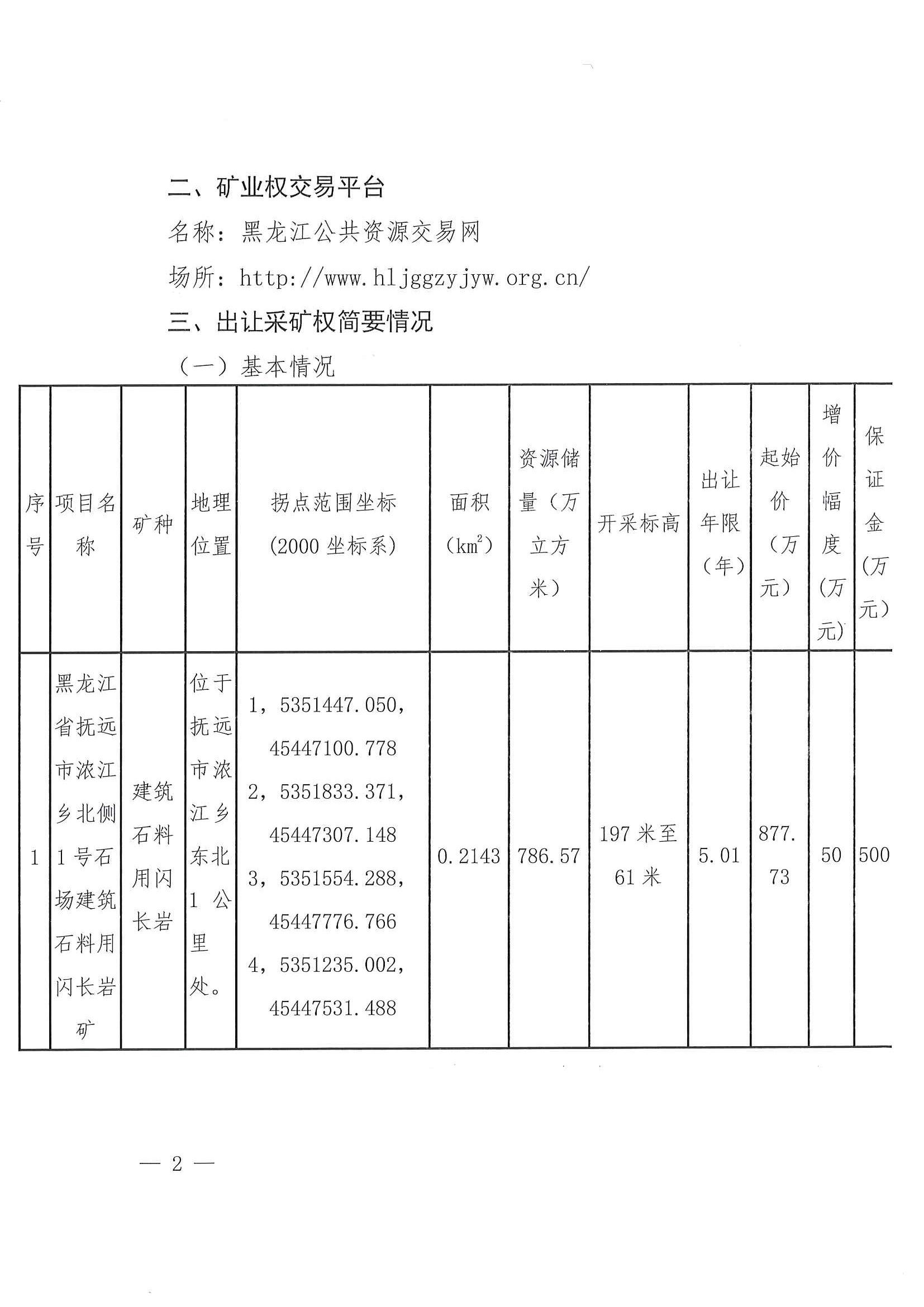 黑龙江省抚远市浓江乡北侧1号石场建筑石料用闪长岩矿挂牌出让公告