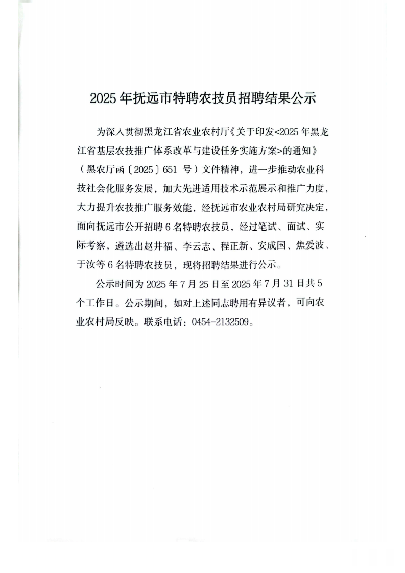 关于印发《2025年抚远市特聘农技员招聘结果公告》的通知