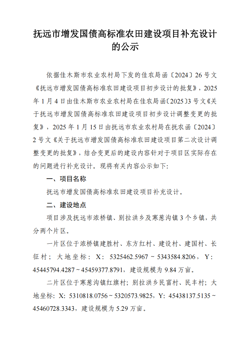 抚远市增发国债高标准农田建设项目补充设计的公示