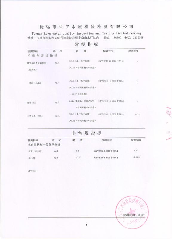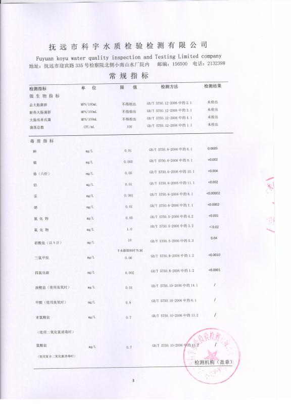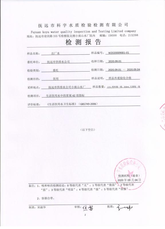 2020年抚远市小南山水厂出厂水第三季度水质检测报告