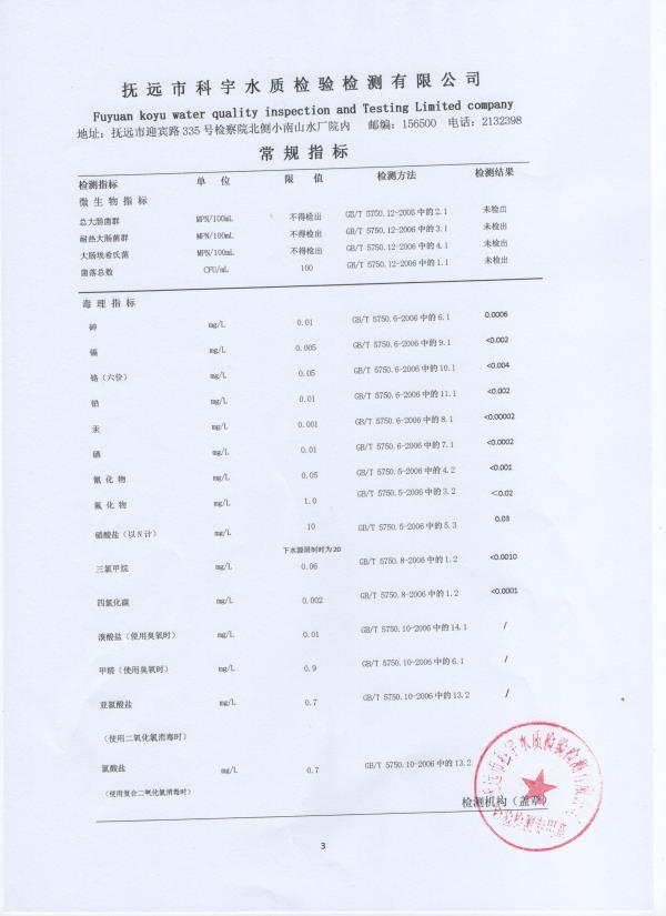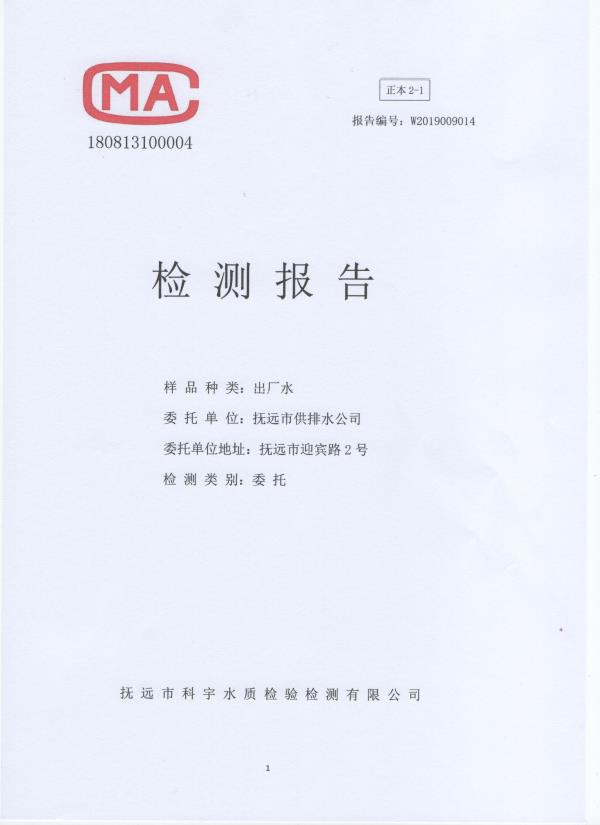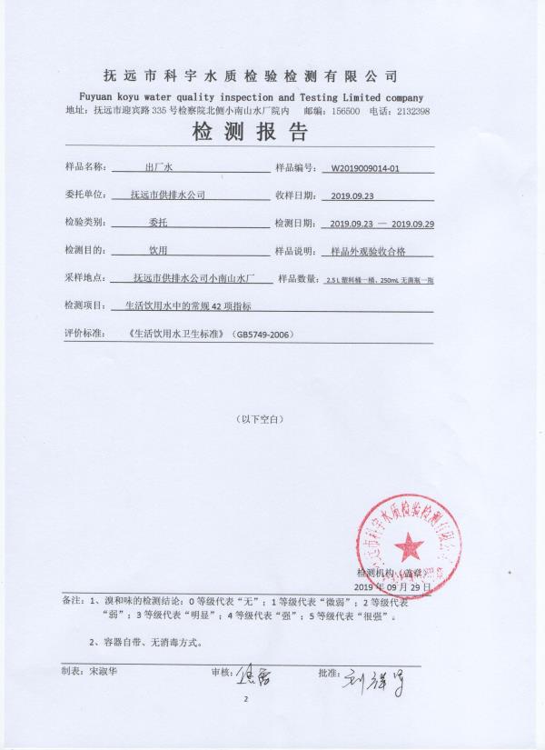 2019年抚远市供排水公司小南山水厂出厂水第三季度水质检测报告