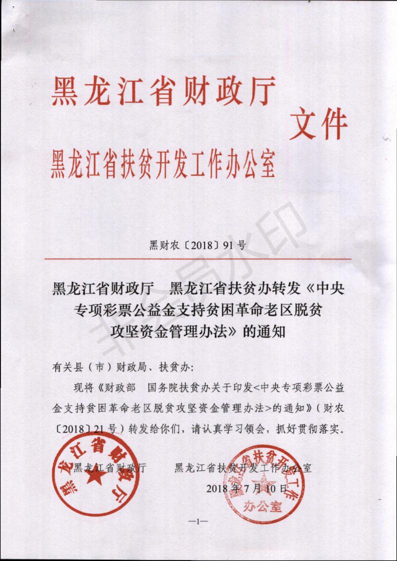 黑龙江省财政厅 黑龙江省扶贫办转发《中央专项彩票公益金支持贫困革命老区脱贫攻坚资金管理办法》的通知